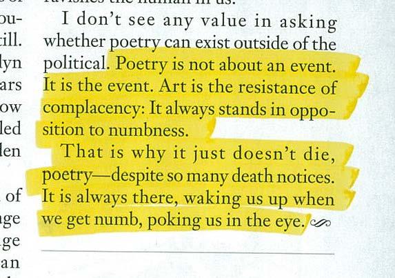 “Poetry is not about an event. It is the event. Art is the resistance of complacency: It always stands in opposition to numbness. That is why it just doesn’t die, poetry—despite so many death notices. It is always there, waking us up when we get numb, poking us in the eye.”